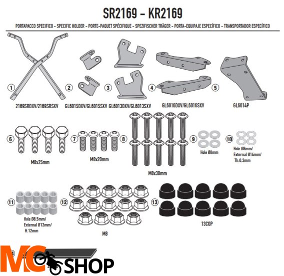 do łączenia z płytą MONOKEY® M5, M7, M8A, M8B, M9A, M9B lub MONOLOCK® M5M lub M6M, lub z płytą już dołączoną do kufra centralnego MONOLOCK®, lub z aluminiowym uchwytem na torbę EX2M / połączenie z M8A, M8B, M9A i M9B nie umożliwia montażu zestawu świateł stop na kufrze i/lub urządzenia do zdalnego otwierania kufra.
