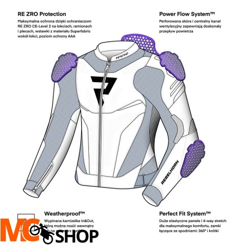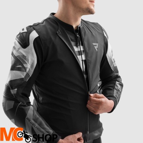 Rebelhorn Inferno oferuje maksymalny poziom ochrony dzięki ochraniaczom RE ZRO® na łokciach, barkach, plecach. Kurtka posiada także kieszeń na ochraniacz klatki piersiowej, który można dokupić osobno. Dodatkowo zewnętrzne slidery na barkach oraz wstawki z materiału Superfabric® wzmacniają szwy, szczególnie w okolicach łokci, zwiększając bezpieczeństwo na trasie i torze.