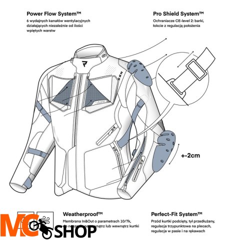 - Membrana: Wypinana membrana In & Out HydraShield o właściwościach wodoodpornych na poziomie 7000 mmH20 i przepuszczalności powietrza na poziomie 10000 g/m2/24h.