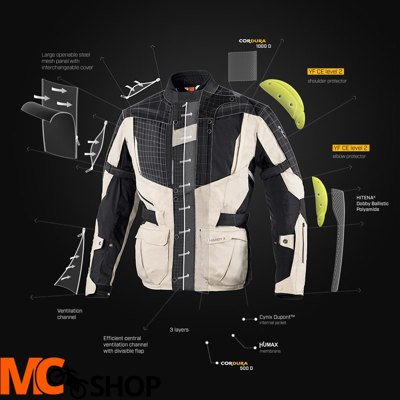 Nowa, ulepszona wersja turystycznego zestawu Hardy, który pokochały tysiące motocyklistów, wzbogacona została o praktyczną, ciepłą wewnętrzną kurtkę, którą po wypięciu możesz założyć do pracy lub na spotkanie z przyjaciółmi. Obszerne, wypinane panele fluo sprawią, że podczas jazdy będziesz widoczny nawet w trudnych warunkach pogodowych.